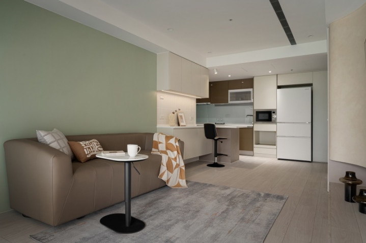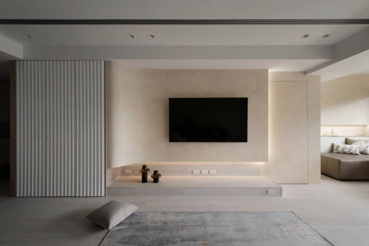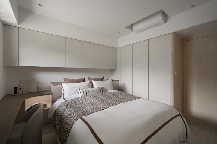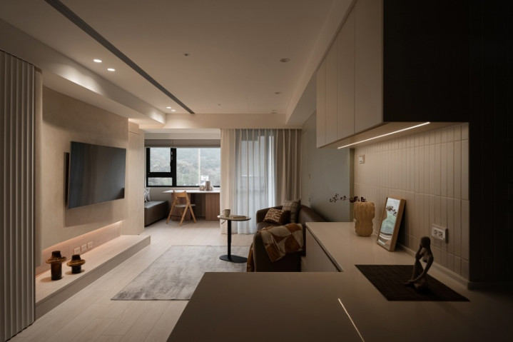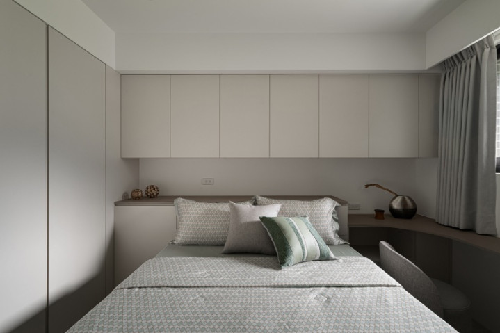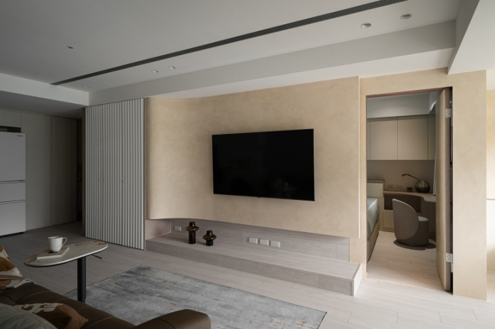 私领域延续温润色调,并设置复合式书桌,以一体化设计维持视觉洁净,亦满足居者多元需求。不仅如此,团队利用纵横线条与弧形语汇交汇,使空间于实用之际更蕴含艺术气质,让日常居所在和谐中盛放诗意。