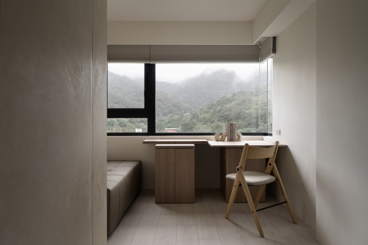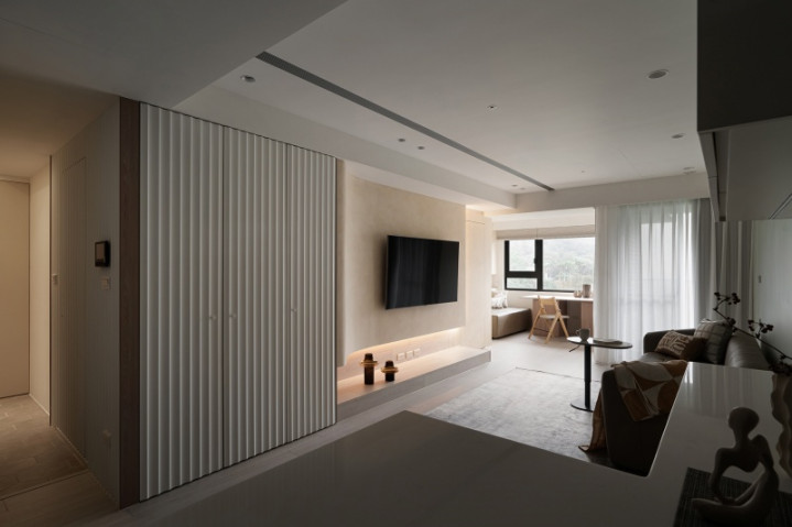 公领域采隐藏式柜体设计,勾勒俐落纯净的日常环境。电视主墙透过叠加方式构筑,融合光源设计与弧形语汇,不仅将立面转化为柔婉背景,更营造细腻雅致的空间格调。此外,窗纱轻覆于场域之上,为空间添上一抹朦胧美感,同时将路线导引至多功能空间,彷若拨云见日,别有洞天,再次呼应「柳暗花明又一村」的设计精神。多功能区域配置方桌,既可作为阅读与书写之所,亦能转换为品茗交流区域,营造闲适惬意的栖居情境。